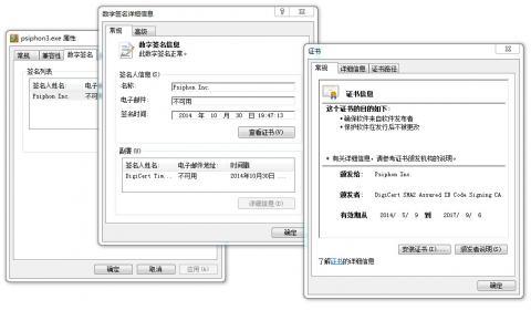 可以看到该文件数字证书签名信息正常,是由 DigiCert 颁发给 Psiphon 公司的证书,签发时间是2014年10月30日。