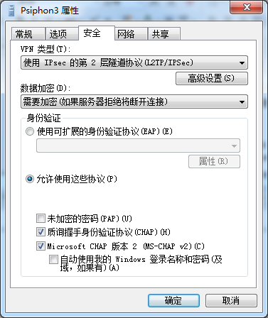 我们继续点击属性查看,可以发现赛风3搭建的VPN服务器采用的是 L2TP/IPSec 方式,这也是目前比较主流的 VPN 连接方式,对于 GFW 的欺骗性要明显强过 PPTP 和 OpenVPN 模式。