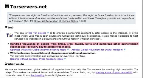 任何人都可以操作节点,也叫做出口继电器,Tor 在 Torservers.net 上提供快且可靠的节点,并帮助需要上网和急切需要匿名的用户。