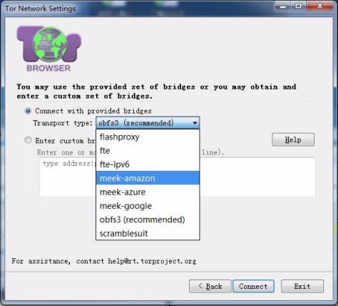 因此选择第一项“需要桥接”,然后选择“meek-amazon”或者“meek-azure”即可(google服务器已经在今年年中被GFW墙掉,而微软和亚马逊的服务器暂时还不会被屏蔽,否则对国内影响太大)